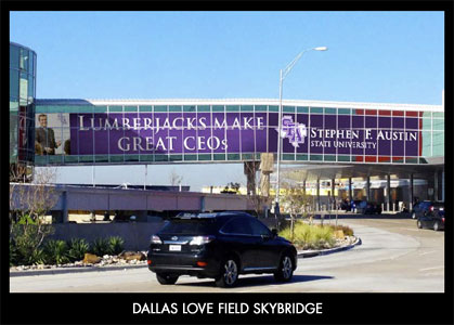 SFA advertisements soon will greet travelers at Love Field Airport in Dallas and at Hobby Airport in Houston. The Love Field airport Skybridge arches over the main entrance to the airport and soon will be adorned by an 11-foot-tall and 108-foot-wide SFA vinyl. In addition to the Skybridge and billboard-style advertisements in the airports, digital ads will be featured on nine electronic screens at Love Field and on eight screens in Hobby. Both the mall and airport advertisements will remain in place through January 2015 to take advantage of the increases in traffic associated with holiday shopping and traveling.