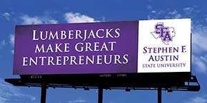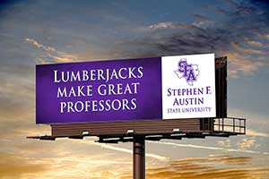 More than 1,000 stakeholders responded to a poll that was distributed to students, alumni, faculty, staff and friends of SFA to assist in selecting new professions to be highlighted on billboards and added to the collection of careers featured in other advertising during the next campaign. More than 96 percent of respondents indicated a positive perception of the "Lumberjacks make great" campaign, with 79.7 percent indicating "very positive." This level of support for an advertising campaign is fairly remarkable, and it is a great indication of the opportunity we have to make a positive impact on the future of SFA.