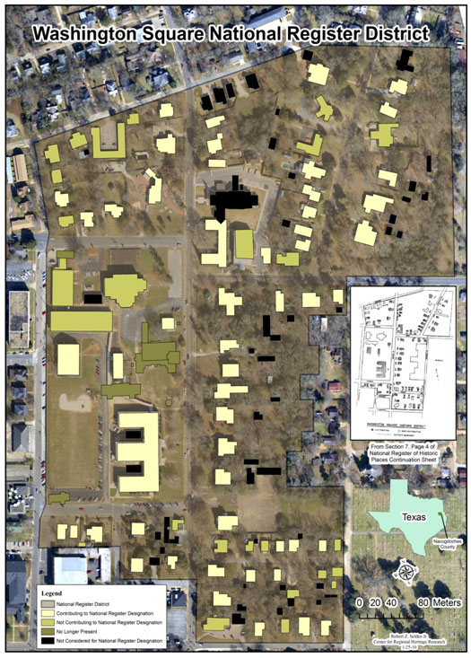Washington Square was nominated for the National Register of Historic Places in 1992, based upon the 1986 Historic Sites Survey conducted in Nacogdoches, Texas. This project will synthesize that information, and absorb it into the current project.