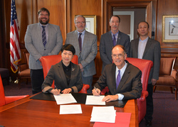 Stephen F. Austin State University's Arthur Temple College of Forestry and Agriculture entered into a partnership with Beihua University, located in China's Jilin Province, with the goal of international research and collaboration across the disciplines of environmental science, forestry and spatial science. Pictured standing from left are Dr. Matthew McBroom, associate dean of SFA's Arthur Temple College of Forestry and Agriculture; Dr. Hans Williams, dean of the Arthur Temple College of Forestry and Agriculture; Dr. Steve Bullard, provost and vice president for academic affairs at SFA; and Dr. Qingfan Meng, dean of Beihua University's College of Forestry. Seated from left are Dr. Zhan Liping, vice president of Beihua University and Dr. Steve Westbrook, SFA interim president.
