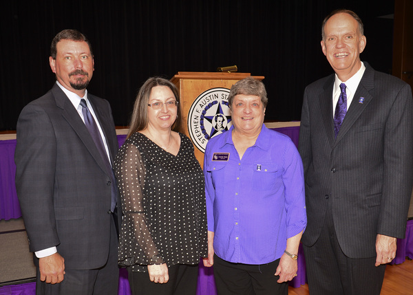Three long-term Stephen F. Austin State University staff members were among those recently honored during a staff recognition ceremony. Nick Stallworth, student center administration, and Carla Chumley, residence life, were each honored for 30 years of service to the university. Carolyn Hardy, who has worked for SFA's admissions office for 50 years, also was honored. Pictured are, from left, Stallworth, Chumley, Hardy and SFA Interim President Dr. Steve Westbrook.