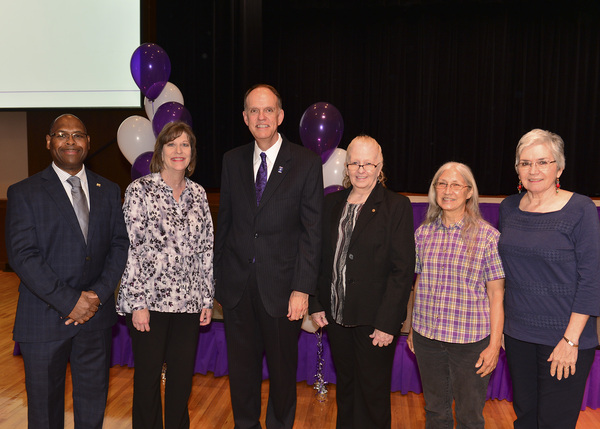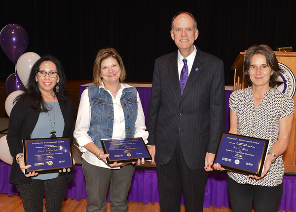 Four SFA employees received the President's Achievement Award in recognition of outstanding achievement and excellent service. Pictured with Dr. Steve Westbrook, SFA interim president, are, from left, Gloria Hoefler-Johnson, languages, cultures and communication; Lisa Stone, James I. Perkins College of Education Student Services and Advising Center; and Inés Maxit, Office of International Programs. Amanda Kennedy, University Police Department, also received the award.