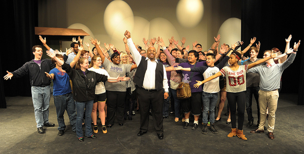 The citizens of Napa Valley agree that Tony, played by Houston senior Cairee Mayfield, is "The Most Happy Fella" in a rehearsal of the musical by Frank Loesser. The Stephen F. Austin State University School of Music will present "The Most Happy Fella" at 7:30 p.m. Thursday through Saturday, April 9 through 11, in W.M. Turner Auditorium on the SFA campus. For tickets or more information, call the SFA Fine Arts Box Office at (936) 468-6407 or visit www.finearts.sfasu.edu.