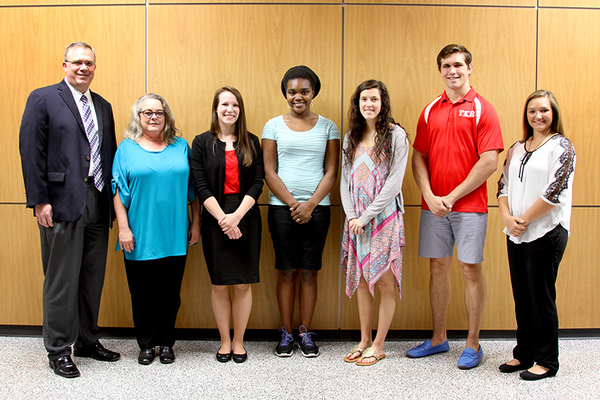 NACOGDOCHES, Texas - Stephen F. Austin State University's Nelson Rusche College of Business announced its sophomore Student Success Passport Program scholarship recipients. The college awarded one $2,500 scholarship to the top scholar and 10 runner-up scholarships for $1,000 each. Pictured, from left, are Dr. Timothy Bisping, dean of SFA's Nelson Rusche College of Business; Sonia Brandon, accounting major from Nacogdoches; Joni Shrader, business economics major from Dickinson; Briana Bradford, accounting major from The Colony; Nicole Wood, economics major from Greenville; Lawrence Moore, finance major from Heath; and Megan Dupuis, general business major from Angleton. Scholarship recipients not pictured are top scholar Tanya Moreno, international business major from Houston; Sarah Smith, accounting major from Nacogdoches; BreAnna Locke, accounting major from Dallas; Lori Watson, business economics major from Amarillo; and Dustin Harrison, finance major from Anahuac.