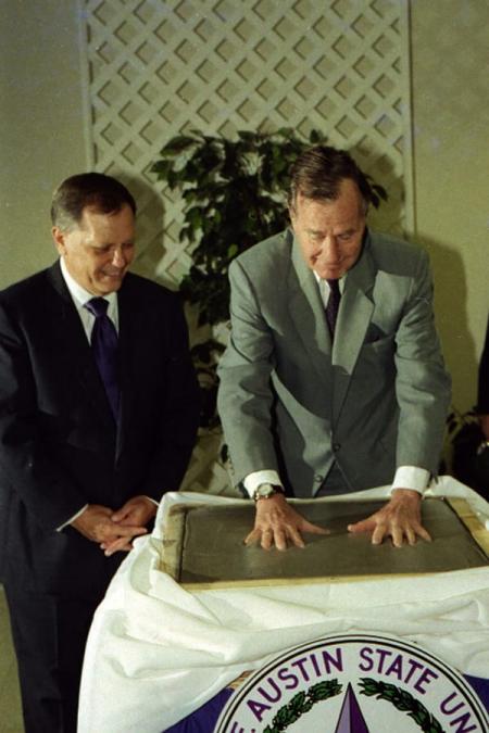 Following his commencement address, he provided his handprints and signature for a display in SFA’s Spirit Lounge, a tribute to leaders who have made a permanent impression on the university. His handprints are joined by those of his son, former President George W. Bush, as well as handprints of former U.S. Senators Phil Gramm and Kay Bailey Hutchinson and former Gov. Rick Perry.