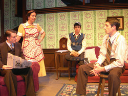 Pictured, from left, Jason Zednick, Emily Womack, Nicholas Mills, and Mark McManus.SFA theatre students rehearse a scene from the SFA School of Theatre's production of Neil Simon's comedy "Brighton Beach Memoirs." Pictured, from left, are Jason Zednick, Jacksonville senior who plays Jack Jerome; Emily Womack, Katy senior who portrays his wife, Kate; Houston senior Nicholas Mills who plays their 14-year-old son, Eugene; and Houston senior Mark McManus who portrays the Jerome's 18-year-old son, Stan. The award-wining play that provides a humorous but poignant look at a Jewish-American family in the 1930s continues tonight through Saturday, Oct. 4, in W.M. Turner Auditorium of the Griffith Fine Arts Building. Tickets are $12 for adults and $6 for seniors or students. The play is recommended for mature audiences. For tickets or more information, please visit www.safsu.edu/finearts or call (936) 468-6407 or (888) 240-ARTS.