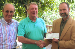 Pictured from left, Dr. William Arscott, Charlie Howard and Dr. Scott RobinsonCharlie Howard (center), organizer of the East Texas Landman's Charity Golf, recently donated $2,600 of the proceeds from the event to the cinematography program of the Stephen F. Austin State University School of Art. The golf tournament was sponsored in part by Chesapeake Energy and Burk Royalty. Pictured with Howard, from left, are Dr. William Arscott, regents professor of art and head of SFA's cinematography program, and Dr. Scott Robinson, director of the SFA School of Art.