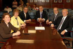 Officials from Grayson County College and Stephen F. Austin State University met recently to sign a formal articulation agreement between the two institutions. Pictured from left are Dr. Ann Kirch, GCC dean of academic instruction; Dr. Jeanne Hardin, GCC vice president of instructional services; Dr. Alan Scheibmeir, GCC president; Dr. Baker Pattillo, SFA president; Dr. Richard Berry, SFA provost and vice president for academic affairs; and Dr. John Jacobson, dean of SFA's James I. Perkins College of Education.DENISON, Texas -- Grayson County College students wishing to pursue a bachelor's degree and teacher certification at Stephen F. Austin State University now can enjoy a seamless transition between the two institutions.