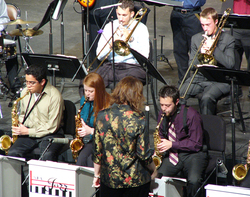 SFA jazz students, under the direction of Deb Scott, perform during a concert. SFA's two jazz ensembles, the Swingin' Axes and the Swingin' Aces, will present their season-opening concert at 7:30 p.m. Friday, Oct. 10, in W.M. Turner Auditorium.NACOGDOCHES, TEXAS - Stephen F. Austin State University's jazz bands, The Swingin' Axes and the Swingin' Aces, will present a joint concert at 7:30 p.m. Friday, Oct. 10, in W.M. Turner Auditorium on the SFA campus.