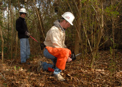 Bryan Deak (left) and Carnan AndersonStephen F. Austin State University horticulture students Bryan Deak of Nacogdoches, left, and Carnan Anderson of Bowie work to eradicate privet hedge from the university's Pineywood Native Plant Center. SFA recently received a grant from the U.S. Fish and Wildlife Service "Partners for Fish and Wildlife" program to fund the removal of the invasive exotic plant from China that was originally introduced into the southern United States as an ornamental plant useful for making a thick hedge. However, if not controlled, it can quickly smother out native plants in the landscape. More than 20 acres at the Pineywood Native Plant Center were recently cleared with machinery from Raven Environmental, a Texas-based company. Dr. David Creech, co-director of the center said, "Our goal is to be essentially free of this noxious pest in three to five years. Then we will be nurturing the native plants that emerge, as well as introducing native plants most likely to find the center an appropriate home."