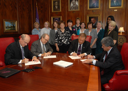 Dr. Robert Aguero, Tarrant County College District's vice chancellor for learning support services, participated in the signing. Aguero earned a master's degree in education from SFA in 1979.