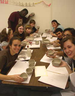 Pictured clockwise from bottom left, are Caitlin Williams, Caroline Preston, Allison Jeffrey, Kwaku Hemeng (standing), Hayden Himes, David Stephens, Sylvia Salas, Eddie Mendez, Maria Alvarado and Annie McCabe.SFA art education students and participants in the October Creative Arts Saturday ceramics class show off the bowls they made for the Bowls of Hope Charity Dinner to be held from 5 to 7 p.m. Wednesday, Oct. 28, at the Hotel Fredonia. Everyone who attends the dinner will receive a hot soup dinner donated by the hotel and a hand-made ceramic bowl created by either a Creative Arts Saturday participant or an art student from McMichael Middle School or SFA. The $10 tickets can be purchased at the event or through the SFA School of Art. Donations are welcome. All proceeds go to the local Helping Other People Eat charity to help feed the residents of Nacogdoches. For more information, please call Dr. Marsha Blount at (936) 468-4804.
