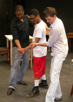 La Porte sophomore Eddie Edge (right) teaches Round Rock junior Waldron A. Archer (left) and Corpus Christi sophomore Kory Pullam (center) steps for a dance sequence in SFA School of Theatre's current production of Athol Fugard's "'Master Harold' . . . and the boys." The play, one of three included in the Summer Repertory season, will be presented for the last time at 7:30 p.m. Thursday, July 16, in the Downstage Theatre of the Griffith Fine Arts Building.NACOGDOCHES, TEXAS - Even inexperienced theatre-goers can recognize that the dance sequences included in SFA School of Theatre's current productions of "Schoolhouse Rock Live! Too," "'Master Harold' . . . and the boys" and "Picnic" require the actors to memorize and practice the dance steps taught by the choreographer.