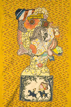 The artist's Web site includes her own explanation of her process: "Because I begin each drawing with a new assortment of commercially printed cloth fragments and another patterned fabric as a ground, my drawings can look very different, one from another. Over days and weeks, as I stitch into the scraps of fabric and the patterned ground, doing and re-doing, drawings take shape under my hands-but not entirely under my control-depicting people in circumstances I could never have imagined, but recognizably of this world."