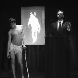 Stephen F. Austin State University theatre majors rehearse a scene from the School of Theatre's upcoming production of Bernard Pomerance's "The Elephant Man" at 7:30 p.m. Tuesday, Feb. 24, through Saturday, Feb. 28. Pictured are El Campo junior David Hathway (left) who portrays the historical John Merrick shown in the slide, and Sean Fitzpatrick, Tulsa, Okla., senior who plays Dr. Frederick Treves.NACOGDOCHES, TEXAS - The SFA College of Fine Arts and School of Theatre will present Bernard Pomerance's "The Elephant Man" at 7:30 p.m. Tuesday, Feb. 24, through Saturday, Feb. 28, in W.M. Turner Auditorium as part of the University Series.