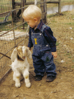 Gene Brown, III, of Bastrop pets a baby goat on the farm.