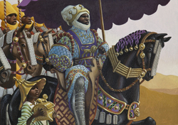 "King on Horse" from the book "Mansa Musa" is one of 75 illustrations that is included in "The Global Artistry of Leo and Diane Dillon" that the SFA School of Art will open at 6 p.m. Friday, Feb. 12, in the Cole Art Center @ The Old Opera House, 329 E. Main St. in downtown Nacogdoches.NACOGDOCHES, TEXAS - Art work by a highly-acclaimed husband and wife team of children's book illustrators is featured in "The Global Artistry of Leo and Diane Dillon," which the Stephen F. Austin State University School of Art will open at 6 p.m. Friday, Feb. 12, in The Cole Art Center @ The Old Opera House.