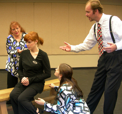 The cast of Stephen F. Austin State University's production of "Side by Side by Sondheim" rehearse the song "Pretty Lady" from Sondheim's musical "Pacific Overtures." Pictured, from left, are Nacogdoches senior Kathryn Knight, Dallas senior Margaret Lewis, League City senior Rebecca Mersinger and Houston junior Justin Hughes.NACOGDOCHES, TEXAS - Songs from Broadway shows such as "West Side Story," "Company" "Follies" and "A Little Night Music" are included in "Side by Side by Sondheim," which the Stephen F. Austin State University School of Theatre will present at 7:30 p.m. Friday, July 9, and Saturday, July 10, and at 2 p.m. on Sunday, July 11, in W.M. Turner Auditorium. The musical revue is part of the School of Theatre's summer season.