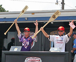 Ryan Watkins, left, and Andrew Upshaw celebrate the Stephen F. Austin State University Bass Club's victory in the Mercury College B.A.S.S. National Championship last weekend in Arkansas. The title is the second for SFA in the past seven years. Upshaw also earned a berth in the 2012 Bassmaster Classic.Mercury College B.A.S.S. National Championship
