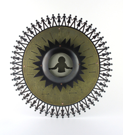 One hundred human-like forms that McAdams calls "flying rings," all cast from the same form, are included in the large sculpture, "The Average Dude." Their installation on individual steel rods allows them to move slightly in response to passersby and therefore have "potential energy," the artist explained.