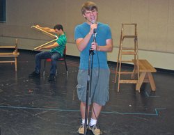 Sugar Land sophomore Daniel Miller practices the moves he will employ in a full-body puppet of the man-eating plant in "Little Shop of Horrors" while Pearland sophomore vocal performance major Jake Trapp, who speaks and sings the plant's role, rehearses one of the blues-rock songs of the pop hit musical presented by the SFA College of Fine Arts University Series at 7:30 p.m. Oct. 9 through 13 in W.M. Turner Auditorium.NACOGDOCHES, TEXAS - The exceptional talent of the student performers and directing faculty in Stephen F. Austin State University's Schools of Theatre and Music will be showcased when "Little Shop of Horrors" takes center stage at 7:30 p.m. Oct. 9 through 13 in W.M. Turner Auditorium as part of the College of Fine Arts' University Series.