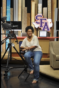 Red Oak native Jade Bly, a sophomore mass communication student at Stephen F. Austin State University, took top honors in the Freedom of Speech Public Service Announcement Competition for college mass communication students. In recognition for placing first in the television category, Bly was honored at the Excellence in Journalism, Student Union event at the recent Society of Professional Journalists National Journalism Conference in Fort Lauderdale, Fla. Bly also received a plaque and scholarship from the Broadcast Education Association and the National Association of Broadcasters Education Foundation. She is pictured with her plaque in the SFA Department of Mass Communication's TV2 Studio.