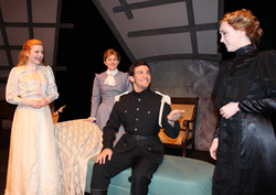 Stephen F. Austin State University theatre students rehearse a scene from Anton Chekhov's "Three Sisters," which opened Tuesday and will be presented nightly at 7:30 through Saturday, March 3, in W.M. Turner Auditorium. In the above scene, the Prozorov sisters, played by (from left) Richmond freshman Katy Rutherford, Longview sophomore Valarie McLeckie and Center Point freshman Sloan Frierson, interview Col. Vershinin, portrayed by Sugar Land freshman Daniel Miller.Stephen F. Austin State University theatre students present Anton Chekhov's "Three Sisters," which opened Tuesday and will be presented nightly at 7:30 through Saturday, March 3, in W.M. Turner Auditorium. The play, written by one of the foremost Russian playwrights and directed by SFA Professor of Theatre Rick Jones, is a joint presentation of the SFA College of Fine Arts and School of Theatre and is sponsored in part by Tipton Ford-Lincoln. Tickets are $18 for adults, $12 for seniors and $6 for students. For tickets or more information, please go to www.finearts.sfasu.edu or call (936) 468-6407 or (888) 240-ARTS.