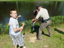 Game Warden Johnny Jones assists a student in bringing in a fish.Fifth-grade students from Broaddus and San Augustine elementary schools participated in the second annual KidFish Program at Stephen F. Austin State University's Piney Woods Conservation Center located in the Powelltown area.