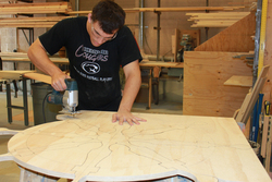 Sugar Land sophomore Daniel Miller cuts out the captain's wheel to be used in the SFA School of Theatre's "How I Became a Pirate," a family musical that will be presented in rotation with "Steel Magnolias" during the 2012 summer theatre season. Please go to www.finearts.sfasu.edu for a complete schedule of performances.NACOGDOCHES, TEXAS - Pirate lovers of all ages are invited to W.M. Turner Auditorium to see any of the eight performances of "How I Became a Pirate," a one-hour musical which the Stephen F. Austin State University School of Theatre is presenting as part of its 2012 summer theatre season Friday, June 22, to Saturday, July 14.