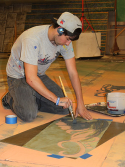 Mesquite freshman Tony Dibernardo, assistant scenic designer for SFA's production of Giuseppe Verdi's "La Traviata," applies Art Nouveau elements to the scenic drops. The Schools of Music and Theatre will present the opera at 7:30 p.m. Thursday, April 19, through Saturday, April 21, in W.M. Turner Auditorium.NACOGDOCHES, TEXAS - The Stephen F. Austin State University College of Fine Arts, School of Music and School of Theatre will present Giuseppe Verdi's opera "La Traviata" at 7:30 p.m. Thursday, April 19, through Saturday, April 21, in W.M. Turner Auditorium, located in the Griffith Fine Arts Building.