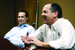 Rudy Becerra, left, smiles at comments by his former teacher Michael Munro, who trains future teachers to work with visually impaired students through the James I. Perkins College of Education at SFA. (Daily Sentinel photo by Andrew Brosig)Rudy Becerra may not be able to see, but the Stephen F. Austin State University graduate student has a vision for the future. Just ask Gov. Rick Perry who recently signed a bill Becerra helped draft into law.