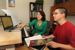 Visiting professor Dr. Maria Grenfell from Tasmania instructs music composition student Stephen Bonilla while teaching this semester at SFA.NACOGDOCHES - The exchange program between Stephen F. Austin State University School of Music and the University of Tasmania Conservatorium of Music is proving to be a win-win collaboration for everyone lucky enough to find themselves involved.