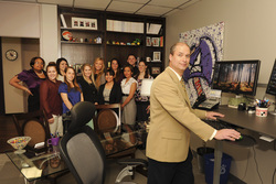 Interior design students pictured are: (back row, from left) La Keisha Grace of San Antonio, Lauren Kulckak of Houston, Kendal Thompson of Lindale, Meredith Clark of Flower Mound and Jason Welch of Fort Worth; (front row, from left) Danielle Zajic of Ennis, Julie Scott of Sugar Land, Ashley Gathright of Frisco, Anahi Reyes of Houston, Geneva Castillo of Iola and Sarah Rowland of El Campo.Junior-level interior design students at Stephen F. Austin State University recently participated in the annual Jack Design Challenge, planning and executing an extensive interior makeover of a university staff member's office. Academic adviser Billy Harris (pictured in foreground) was chosen as the winner of this year's office makeover. The redesign features a stand-up desk, custom glass-top table and original "angry axe" artwork provided by School of Art faculty member Peter Andrew.