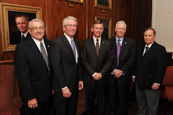 Pictured, from right, are Dr. Baker Pattillo, university president; Barry Nelson of Dallas, newly appointed regent; David Alders of Nacogdoches, newly appointed regent; Bob Garrett of Tyler, re-appointed regent; and Steve McCarty of Alto, board chairman.New members of the Stephen F. Austin State University Board of Regents attended quarterly meetings recently on the SFA campus.
