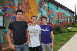 SFA art students, from left, Santiago Escobedo, Levi Smith and Daniel Baugh recently completed a mural depicting the history of Nacogdoches on a brick wall at the Russian River apartment complex on Austin Street. The mural is called "Winds of Change."Three SFA senior art students spent a few weeks this summer helping to beautify Nacogdoches. Daniel Baugh of Austin, Nacogdoches native Levi Smith and Santiago Escobedo of Carthage teamed up to paint a mural depicting the history of Nacogdoches on a brick wall at the Russian River apartment complex on Austin Street.