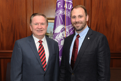 Dr. R. Tyler Spradley, assistant professor of communication studies at SFA (right), recently received the Jim Towns Mentoring Professorship. The award is named for longtime communication studies professor Dr. Jim Towns (left) and recognizes professors who instill, foster and promote a mentoring culture at SFA.NACOGDOCHES, Texas - Dr. R. Tyler Spradley, assistant professor of communication studies at Stephen F. Austin State University, is the latest recipient of an endowed professorship established to reward faculty members who are excellent teachers and serve as mentors to their students.