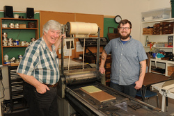 SFA senior art major Caleb Rose, right, is the first recipient of the Charles D. Jones Art Scholarship recently established by the SFA Friends of the Visual Arts. Jones, who taught for 41 years at SFA, is now director and master printer for SFA School of Art's LaNana Creek Press.NACOGDOCHES, TEXAS - The SFA Friends of the Visual Arts board recently established a scholarship in honor of Charles D. Jones, long-time Stephen F. Austin State University School of Art professor.