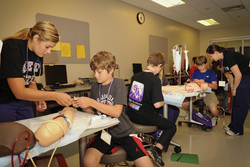 Pictured, from left, are SFA nursing student Hanna Hudson, Huntington Middle School student Cason Young, Lufkin Middle School student Sam Ellisor, Harlingen Middle School student Jimi Abbott and SFA nursing student Katy Trotty. The middle school students were learning how to start an IV on patient simulators in SFA's Richard and Lucille DeWitt School of Nursing.Nearly 100 middle school students from more than a dozen area school districts are attending iMAS (Investigations in Math and Science) Academy this week at Stephen F. Austin State University. SFA STEM (Science, Technology, Engineering and Mathematics) faculty members are guiding students in the discovery of academic skills necessary for future STEM careers. Students are working collaboratively to solve real-world problems as they work through modules such as Crime Solvers (CSI), ER, Magic Cone (conics) and What's in Your Water.
