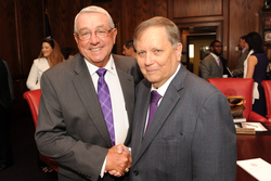 SFA president Baker Pattillo, right, congratulates Board of Regents Chairman Steve McCarty for being named athletic director emeritus at Tuesday's quarterly board meeting.NACOGDOCHES, Texas - Stephen F. Austin State University President Baker Pattillo surprised Steve McCarty, retired athletic director and current chair of the Board of Regents, at the board's Tuesday meeting by awarding him a new title: athletic director emeritus.