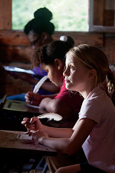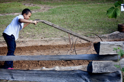 Izaiden Thomas Blanton, a third-grader at Nettie Marshall Academy of Dual Language, practices pushing an old hand tiller through a patch of soil at Millard's Crossing Historic Village. The garden work was one of 10 stations at which the students learned about life before modern conveniences during the Hands on History field trip Thursday. The event is a partnership between Stephen F. Austin State University's James I. Perkins College of Education and Millard's Crossing.