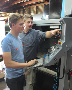 Matt Turner, SFA alumnus and owner of Turner Fabrication, (right) shows exchange student Jonatan Jakobsson how to use equipment in his metal fabrication shop. Jakobsson will observe the daily operations of Turner Fabrication for one month before returning to Älvdalens, Sweden, to complete his final year as a welding student at Älvdalens Educational Center.NACOGDOCHES, Texas - Matt Turner, a 2009 graduate of Stephen F. Austin State University's forestry program and owner of Turner Fabrication, is hosting a Swedish exchange student for one month as a part of the Arthur Temple College of Forestry and Agriculture's partnership with Älvdalens Educational Center in Älvdalens, Sweden.