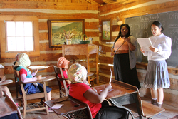From left: Stephen F. Austin State University elementary education majors Brinisha Shaw and Holly Franz experience life as a teacher in the 1900s as they teach third graders a reading lesson in a one-room schoolhouse at Millard's Crossing Historic Village. This activity was part of the annual Pioneer Days event coordinated by SFA, Millard's Crossing and area schools.NACOGDOCHES, Texas - Digging the plow into the textured soil, farmer Pete, played by Stephen F. Austin State University senior Michael Correll, teaches dozens of third grade students from Nacogdoches Independent School District about subsistence farming and life on a farm in rural East Texas in the early 1900s. As he carves out each row in his garden, Pete explains how chain grocery stores were nonexistent in his day and how families had to grow the food they wanted to eat.