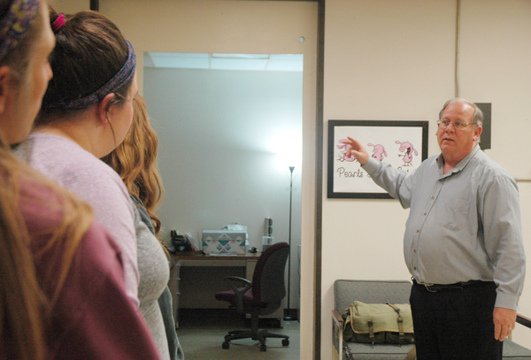 Stephen F. Austin State University students in SFA Mass Communication Lecturer Greg Patterson's Graphic Design for Media class visit Tuesday with Robin Land, right, publisher of The Daily Sentinel. The MCM 403 students toured the Sentinel office, speaking with Land and other staff members on the fluid nature and future of news as well as how reporters and designers manage time, among other topics. "Visiting media professionals helps students experience and understand the role of media in society, which is one of our program learning objectives," Patterson said. "The visit helped to emphasize the importance of organization and time management, which is essential for journalists working with tight deadlines. Another course goal is the ability to understand and explain the role of graphics typography, design and layout in print and digital communications." The trip enabled students to connect classroom lessons with real-world examples. "I think the most interesting thing for me during the trip was learning that reporters write 40 to 60 different stories a month. I know for myself that it is sometimes difficult to complete one story a week in my classes, so this was good preparation for me," said Emily Brown, a MCM 403 student. "Trips that specifically put students into their field are important. It is good knowledge for me to have of how a real newspaper works, and I was able to see more of the things my professors talk about."