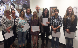 Some of the SFA Art Alliance 2017 Spring Show winners and their faculty sponsors are, front, from left, Sharon Robinson, Selena Rodriguez, Bailey Crow, Sarah Jentsch, Javier Vega, Shelby Locklin, back, from left, Michelle Filer, Jill Carrington, professor and Art Alliance treasurer, and Christopher Talbot, director, School of Art.NACOGDOCHES, Texas - The Art Alliance student organization at Stephen F. Austin State University recently held its 34th Annual Spring Art Show in the School of Art galleries. Forty-four art students entered 82 works.