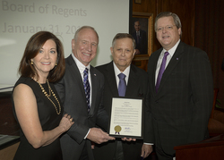 Dr. Robert and Kathy Lehmann will be honored with a building dedication ceremony at 11 a.m. Tuesday, April 25, on the SFA campus. SFA's Board of Regents voted to name the university's Chemistry Building in the Lehmanns' honor in January. Pictured, from left, are the Lehmanns; SFA President Dr. Baker Pattillo; and Dr. Scott Coleman, chair of the SFA Board of Regents.NACOGDOCHES, Texas - A dedication ceremony celebrating the naming of the Robert and Kathy Lehmann Chemistry Building will be held at 11 a.m. Tuesday, April 25, in the Baker Pattillo Student Center Plaza, located at the front entrance to the Chemistry Building.