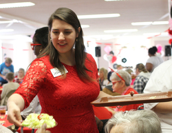 Stephen F. Austin State University Phi Upsilon Omicron member Jessalyn Welch serves salads to guests attending a 1950s-themed Valentine's Day event. Recently, students in SFA's School of Human Sciences Phi U honor society partnered with Carolyn Johnson of Heart to Heart Hospice to host the annual community service project at the First Baptist Church Fellowship Hall.NACOGDOCHES, Texas - Stephen F. Austin State University students recently flashed back to the 1950s by hosting a themed Valentine's Day event for residents of nursing homes and assisted living facilities in Nacogdoches.