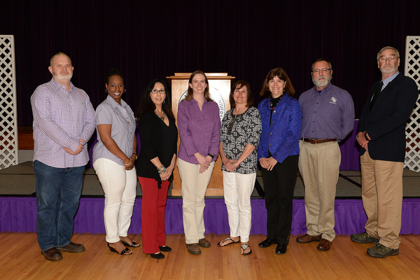 Also honored, but not shown, were Brittany Beck, Admissions; Kelley Consford, Campus Recreation; Sara Cole, Cathrine Dodge and Heather Stewart, Education; Ann Hall, Financial Aid, Aleta Spivey, Human Resources; Charlotte Sullivan, Office of the President; Richard Luna, Forestry; Amy Smith, Student Rights and Responsibilities; Joan Taylor, Center for Teaching and Learning; Patrick Brazeal and Donna Hammond, Residence Life; Jamie Bouldin, Student Affairs; Amy Maurer, Controller's Office; Sandra Menscer and Stephen Rasmussen, Telecommunications and Networking; and Jesse Raymond Bell, Jo Ann Fields, Erik Green, Santiago Orozco, Jonathan Ramey and Jody Russell, Physical Plant.