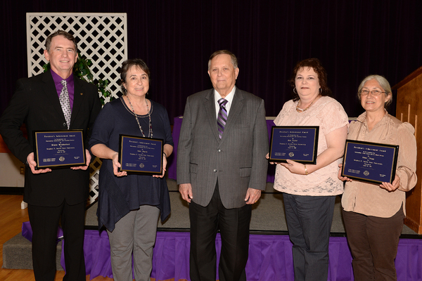 Four SFA employees received the President's Achievement Award in recognition of outstanding achievement and excellent service. Pictured with SFA President Baker Pattillo, center, are Wayne Weatherford, Agriculture; Anne Uhyrek, Controller's Office; Ann Foster, Procurement; and Diane Stepp, Registrar's Office. Employees are nominated by their colleagues to receive the award.