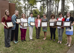 Stephen F. Austin State University's James I. Perkins College of Education recently selected recipients for the college's Teaching Excellence Awards. From left, Sarah Drake, clinical instructor in the School of Human Sciences; Erica Dillard, lecturer in the Department of Elementary Education; Deborah Cady, clinical instructor in the School of Human Services; Patty Berthot, lecturer in the Department of Kinesiology and Health Science; presenter Dr. Judy A. Abbott, dean of the Perkins College of Education; Dr. Christina Sinclair, associate professor in the Department of Kinesiology and Health Science and interim associate dean for assessment and accountability within the college; Dr. Paige Mask, associate professor in the Department of Human Services; Dr. Leah Kahn, assistant professor in the Department of Elementary Education; and Dr. Mary Olle, assistant professor in the School of Human Sciences.NACOGDOCHES, Texas - Stephen F. Austin State University's James I. Perkins College of Education recently honored several faculty and staff members with the college's Teaching Excellence Awards.