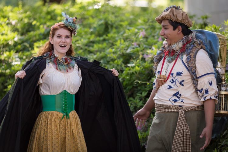 NACOGDOCHES, Texas – The voices and costumes of SFA Opera Theater’s production of “The Magic Flute” are equally stunning, and audiences won’t want to miss either when the schools of Music and Theatre present the classic opera at 7:30 nightly Thursday through Saturday, April 12 through 14, in W.M. Turner Auditorium on the Stephen F. Austin State University campus. Magnolia senior Brittnee Simone as Papagena reveals her true youth and beauty to San Antonio sophomore Greg Garcia as Papageno in W.A. Mozart’s fairy tale for all ages. Tickets are $15 for adults, $10 for seniors and $7.50 for students and youth. For tickets or more information, visit www.finearts.sfasu.edu or call the SFA Fine Arts Box Office at (936) 468-6407.